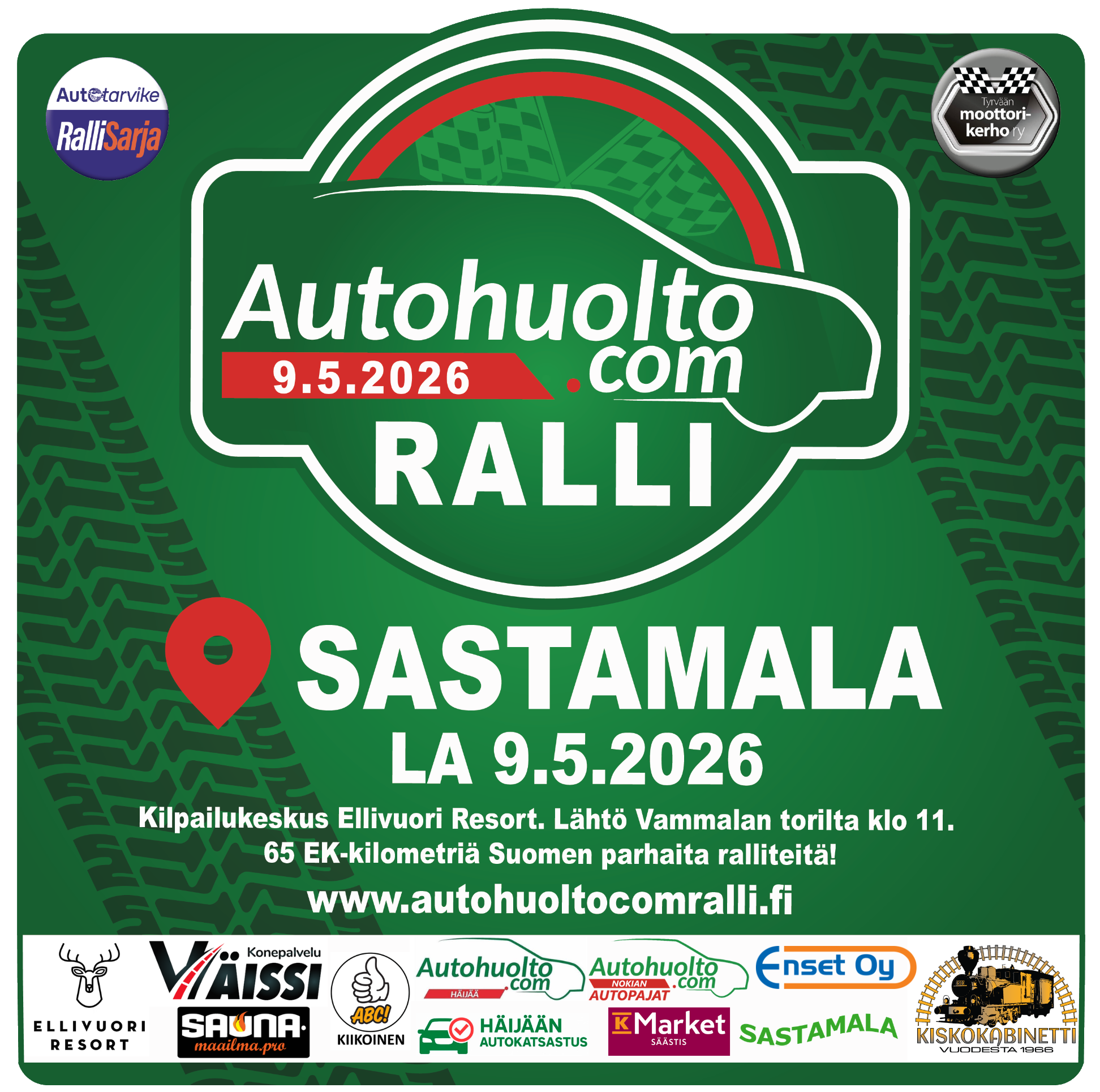 Aika: 9.5.2026 Paikka: Sastamala Laji: Ralli Arvo: Autotarvike Rallisarja 2026 Järjestäjä: Tyrvään moottorikerho ry. Kilpailukutsu: https://ajaksi.fi/wp/09-05-2026-autohuolto-com-ralli/ Ilmoittautuminen: https://ajaksi.fi/wp/09-05-2026-autohuolto-com-ralli/ Lähtöluettelo: Kilpailijainfo: www.autohuoltocomralli.fi